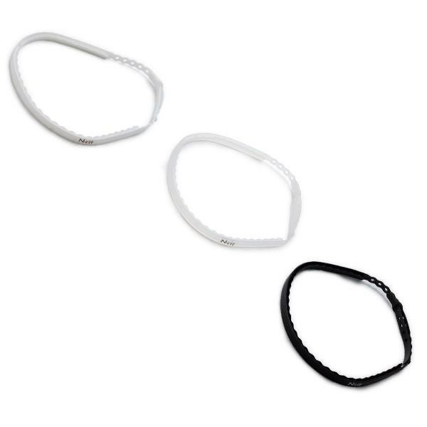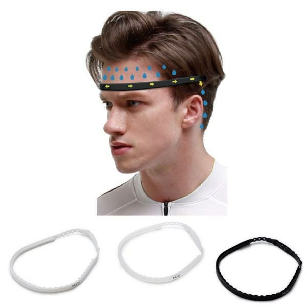 形状は雨樋のような構造をしているため、汗が溝を通じて後方へ流れる仕組みとなっています。頭のサイズに応じてスナップピンボタンで微調整ができ、シリコン素材の適度な伸縮でピッタリフィットします。スポーツ、レジャーでの額からの汗止めとして最適です。