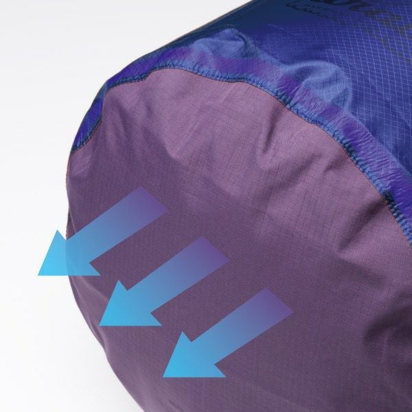 耐水圧10,000mm以上、通気性0.5cfmを誇る高通気素材なので、開口部をロールダウンするだけで内部の空気を驚くほど押し出して抜くことができ、簡単にコンパクトパッキングがおこなえます。
