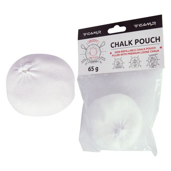 65gの粉末チョークを詰めた詰め替え不要のチョークポーチ。 メッシュネットのポーチに収納されており、チョークの飛散を抑えるクライミングジムでの使用に最適です。