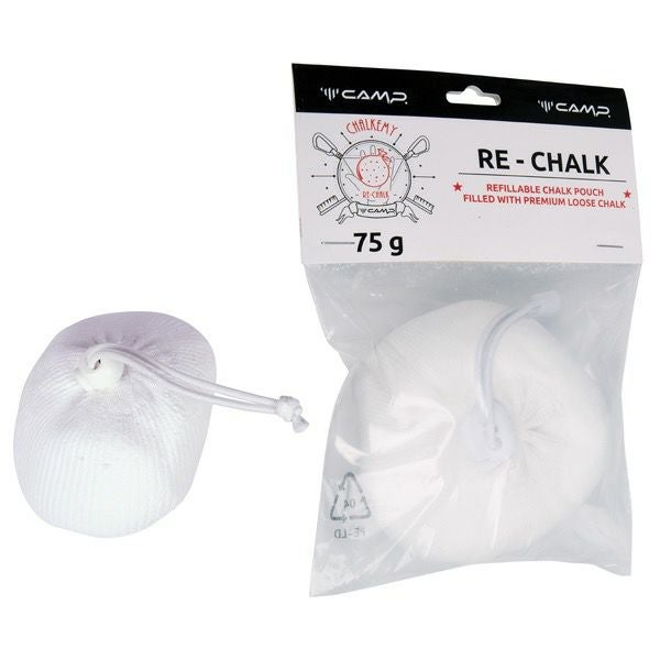 75gの粉末チョークを詰めた詰め替え用ポーチ。 巾着式のメッシュネットのまま使用することでチョークの飛散を抑えクライミングジムでの使用に最適です。
