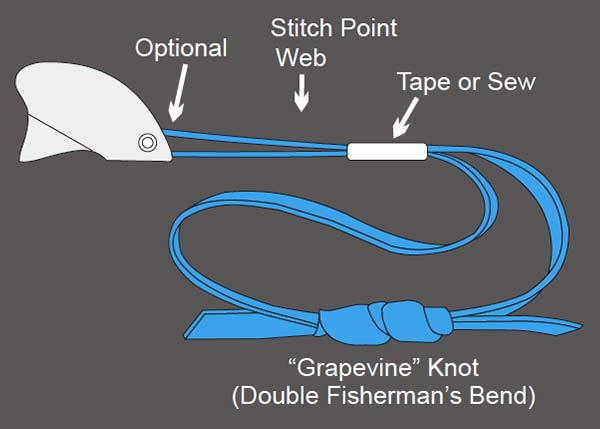 2インチ(約5cm)の長さの軽量なバンジーコードで結ばれたループを3〜4点携帯することをお勧めします。これらのループは、相対で使用されるトライカム(またはトライカムと別のアンカー)間でお互いに一定の張力をかけるために使用できます。(図Gを参照)