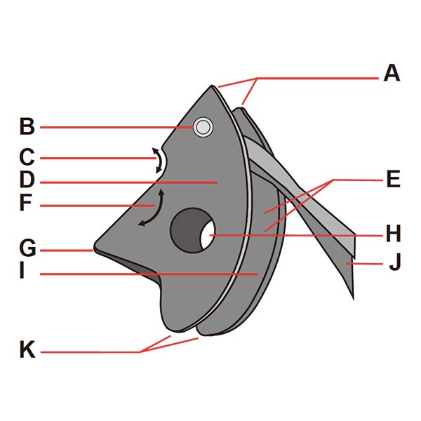 トライカムは、くびれのあるクラックで通常のナットとして使用する場合、カムレールがキーとなって不規則性を排除できるため、ほとんどの従来のナットよりも方向安定性が高くなります。 ただし、一部のセットで標準のカムモードで使用する場合は、二つのトライカムを相対させて慎重にセットする必要があります。落下の力がロープによって、上部のナットだけでなく、下のナットにもどのように伝達されるかを考慮する必要があります(図Hを参照)。