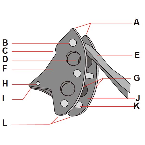 クライミングのプロテクションとしてそうすることは推奨されていませんが、トライカムの#5、6、および7は、図Jに示す構成でうまく重ね合わせることが出来ます。大きいサイズの2つのチャネルピンの間に、常に次のサイズの小さいトライカムの支点を積み重ねます。したがって、#5を#6に積み重ね、#6を#7に積み重ねるか、または3つすべてを直列に積み重ね、#5を#6に、#7に積み重ねることができます。