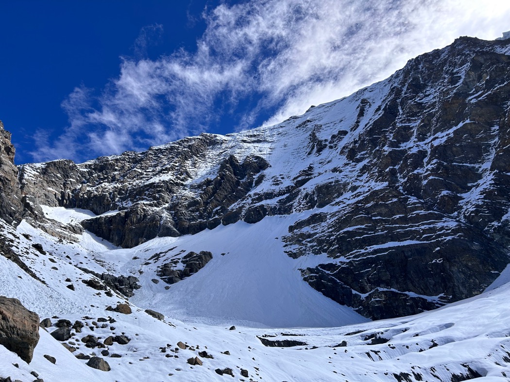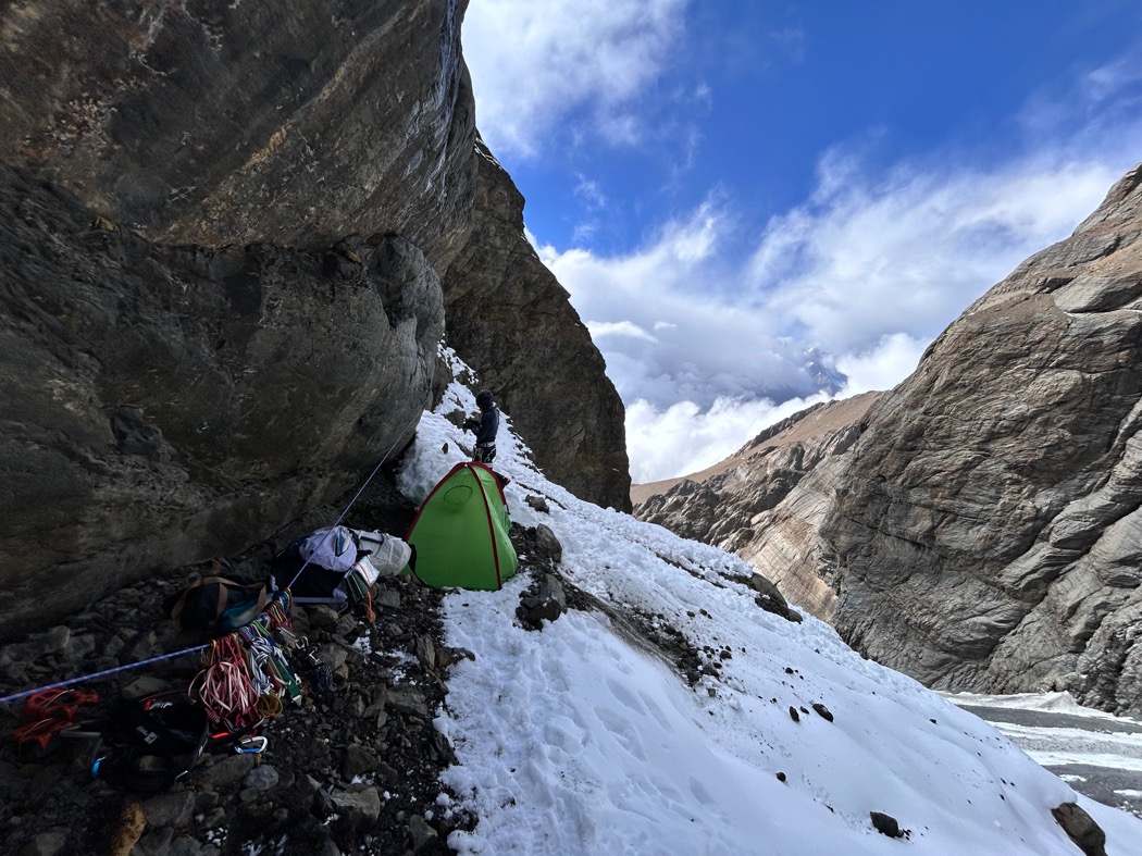 ベースキャンプに到着2日後、さっそく偵察へと向かった。この偵察で谷の中を突破し、西壁の基部に辿り着く。そこで西壁と西稜の偵察を行う予定だ。まずは谷の突破。それができなければ何も始まらない。偵察の初日は、ベースキャンプから歩いて2時間ほどの4200m付近にアドバンスドベースキャンプを構えた。そこからようやく2年間想像してきた谷の中を望むことができた。まるで初対面の恋人に会いにきたような期待と不安が混ざる気持ちで谷の中を眺めた。