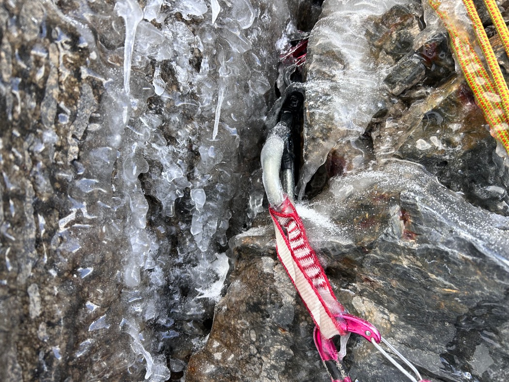 翌日、偵察用の登攀ギアとテント、食料を背負い、いざ谷の中へ入っていく。1時間ほどで最初に見えた1段目の岩壁の基部にたどり着いた。第一岩壁の傾斜は緩いものの、常に大きな落石が頻発していてとても登れるルートではなかった。しかし希望を抱いていた左岸側を見ると落石が比較的少ない。そしてよく観察するとクラックを派生しながら壁を超えて行けそうな1本のルートが見えた。ここだ。さっそく登攀準備をし、壁に取り付いた。岩は脆く、傾斜も徐々にキツくなっていく。幸いプロテクションは豊富に取ることができ、垂直に近いコーナークラックを気持ちよく登っていく。こんな恐ろしい谷の中で楽しく登れているのが笑えてくる。最後に少し被ったクラックとなるが、アックスのピックがしっかり効いているので爽快に登り切った。