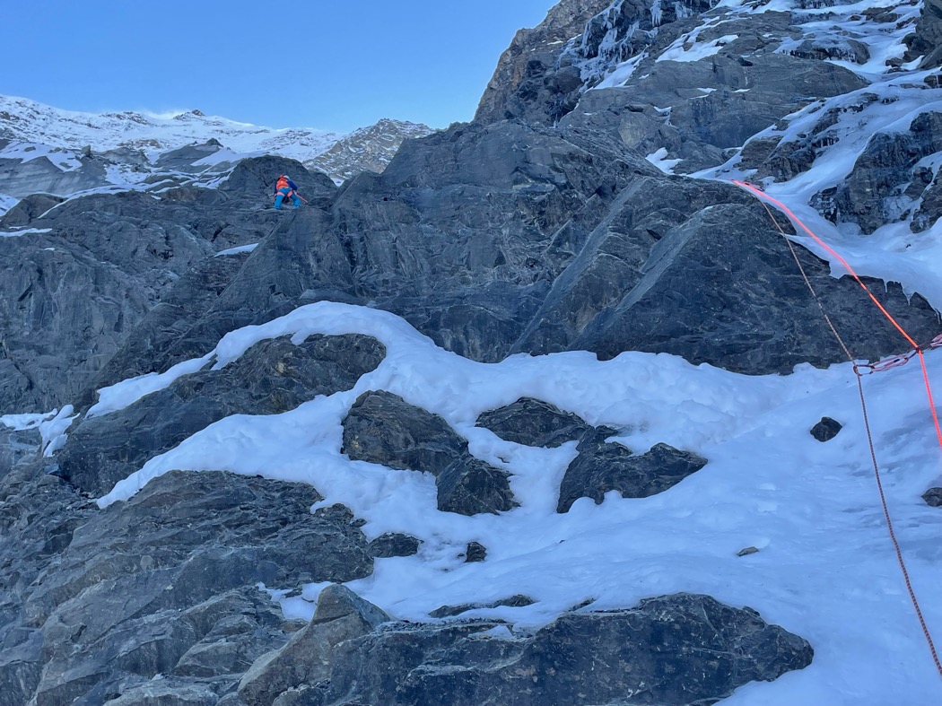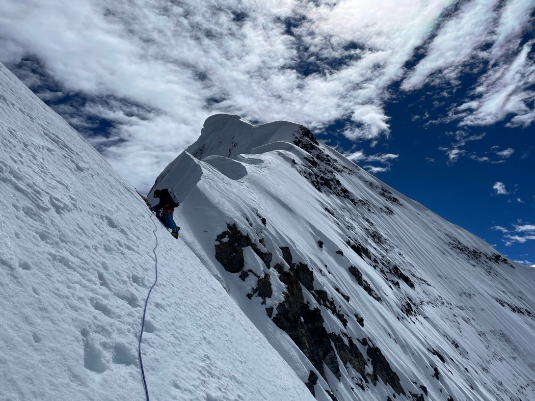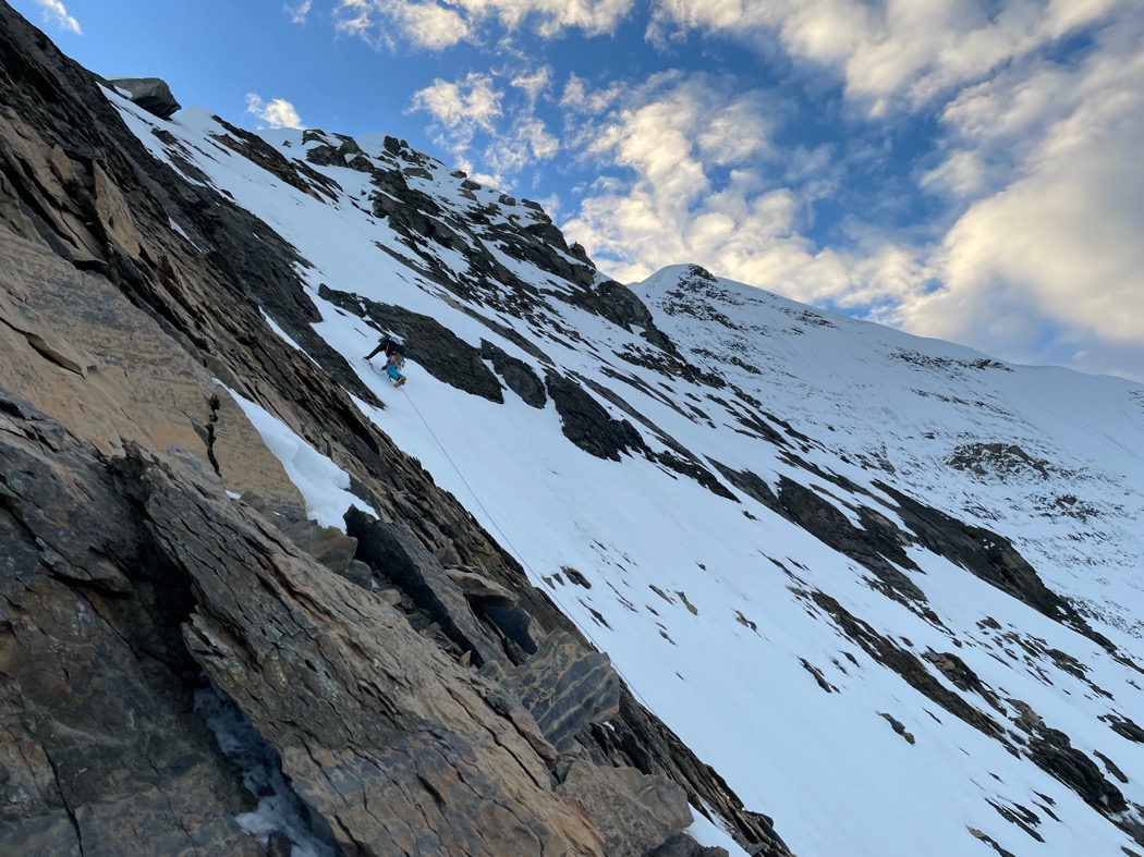 4日目。いつも以上に早めに出発。まだ辺りは暗く、ヘッドライトの灯りを頼りにミックス帯の陰影を縫って登っていく。垂直に近い雪岩を超え、脆いスラブを西壁側にトラバースすると広い雪壁に出ることができた(写真 12)。ロープをめいいっぱい伸ばすと小さなボルダーに辿り着いた。支点構築しながらあるものを発見した。懸垂下降で残置された麻のようなロープスリングであった。きっと初登攀時に使われたものだろう。長い歴史に触れることができ、気を引き締めて上を見上げた。もうしばらく登れば傾斜が緩くなりそうだ。ここから三戸呂にトップを変わってもらい登高していく。傾斜の強い雪壁は私達の足を重くさせる。さらに数100メートル上がると上部に見えた垂直の雪壁が立ちはだかった。三戸呂が渾身の登りでそれ越えると、目の前の景色が一気に広がった。北壁を覆うよう張り出す雪庇と、足元から綺麗に山頂に続いている稜線。山頂は巨大な雪庇の一部だった。