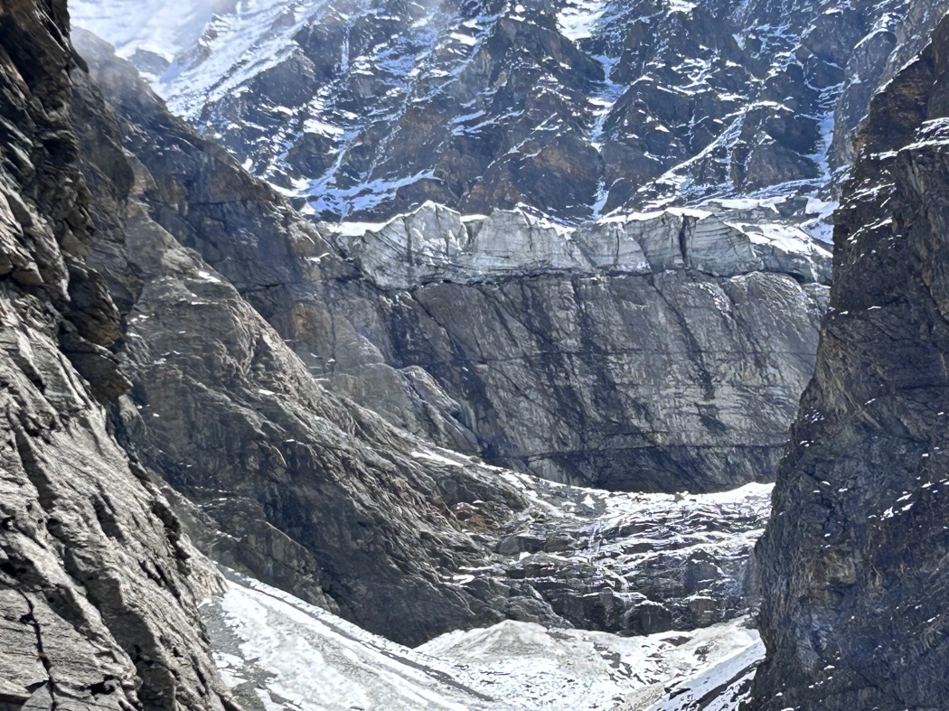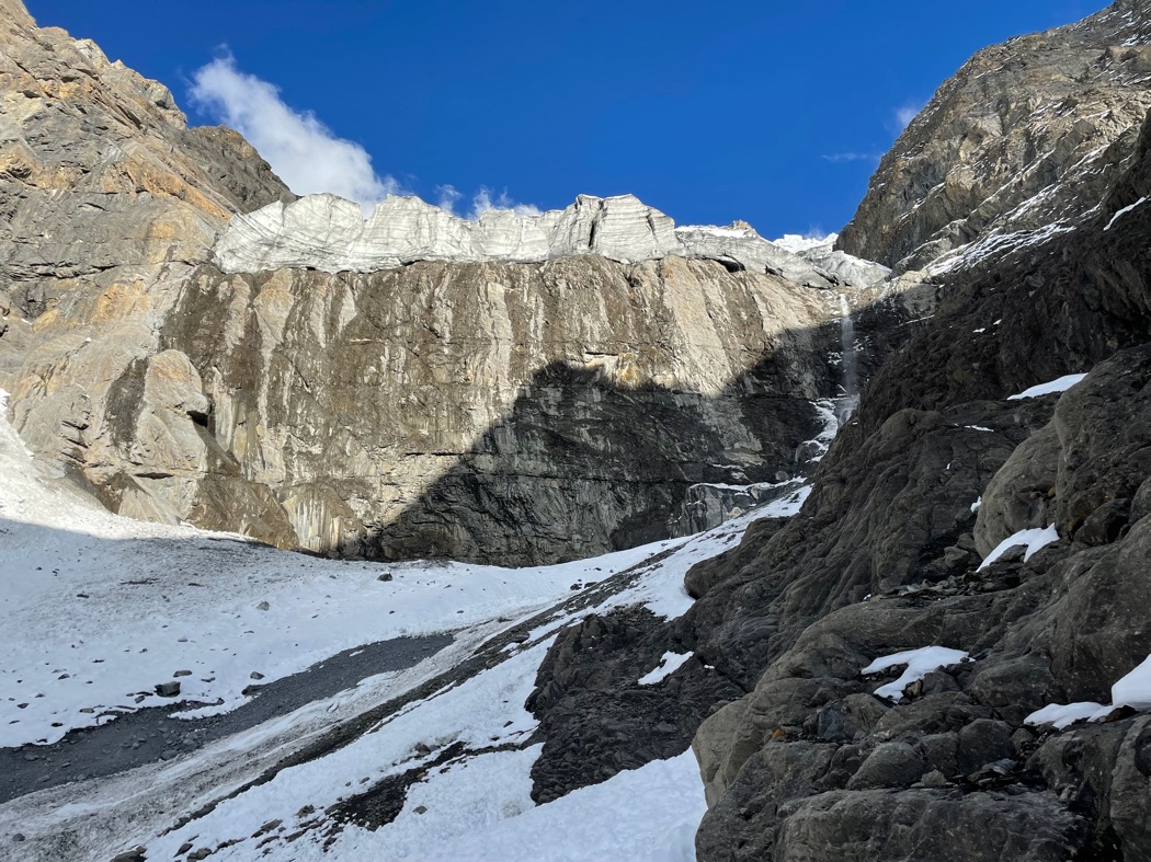 谷の中には2段の岩壁(写真 5)が立ち塞がっていた。1つ目は傾斜は緩く、登るのは容易いだろう。しかしその先に見えた2段目の岩壁が巨大だ。100m以上ありそうな垂直の壁と、上部には10m程の巨大なセラックが乗っている。右岸側は落石が頻発しているようにも見える。想像を超える岩壁を目の前にして、頭の隅でひっそりと存在していた「初日敗退」という文字の輪郭が大きくなっていた。双眼鏡を見ながらクラックを探したり、セラックを迂回できるルートを探したりしたがここからではしっかり見ることができない。