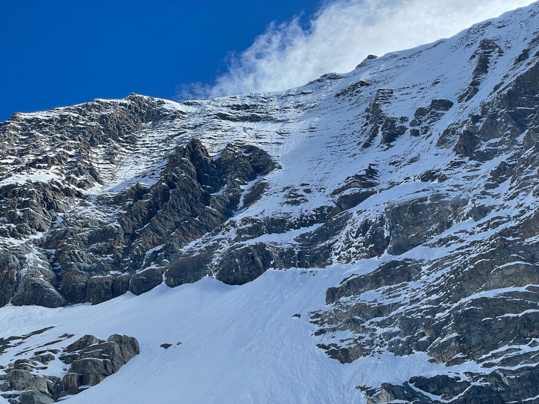 休養中のベースキャンプではどこにルートをとるか話し合った。予定通り西壁をダイレクトに直上するか、西稜のコルに一度出て、西稜を登っていくか。数時間話し合い、私たちは西稜から挑戦することにした。大きな理由としては、西壁の出だしにある100mほどのロックバンドと西壁の中心にある雪崩痕、そして稜線に覆い被さる巨大な雪庇群だ。ロックバンドは傾斜も強く、場所によってはオーバーハング気味にも見える。雪崩は多分大丈夫だろうが、登攀中に襲われると非常に厄介だ。そして最後の雪庇越え。過去に何度か雪庇越えに苦戦した覚えがあり、それを7000m弱の標高で行うのは非常に辛い。それに比べれば西稜はコルまで上がれば所々存在するミックス帯の登攀で頂上まで行けそうに感じた。何よりも山頂を踏める可能性を西稜に感じていたのが大きな理由になる。
