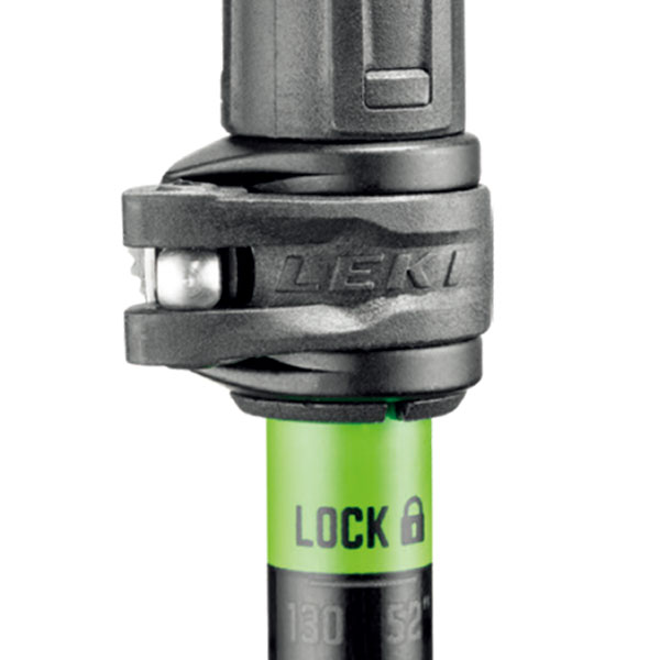 LEKI社のスピードロップシステムは、シャフトの径全体を締め付ける構造で、固定力が高いのが特長です。また、一部分だけを締め付けることによるシャフトの歪みが発生せず、安定した固定力が得られ、固定力の調整自体もダイヤル部で簡単に行えます。