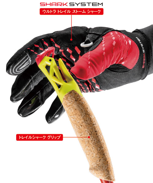 片手でストラップを着脱できるシャークシステムの操作性を継承しながら、グリップ部を太めに設計。トレッキングにもトレイルランニングにも、マルチなシーンで使用できる次世代型グリップです。