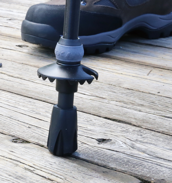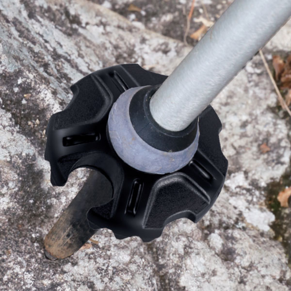 LEKIトレッキングポールにはバスケットを標準装備しています。バスケットは、ポールが岩や木の隙間などに深く挟まるのを防ぐストッパーの役目を果たします。バスケットを外してしまうと、ポールが石突き部分を超えて深く挟まってしまうことがあり、その状態でシャフトに横方向の力を加えると、テコの原理で、軽い力でもシャフトが曲がったり、折れたりする恐れがあります。バスケットは、常に装着した状態でお使いください。