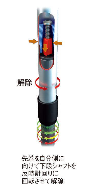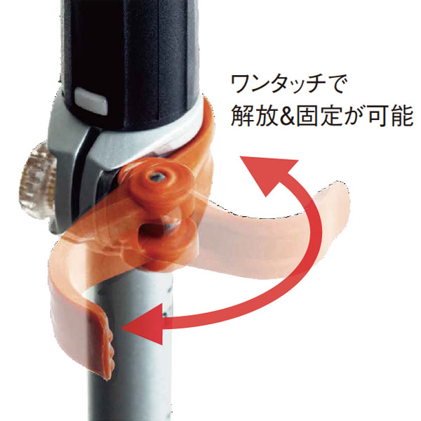 従来のラチェット方式とはまったく異なる新しいロック方式。ポール上部を引き上げるだけでシャフトの固定・解放が容易にできます。
