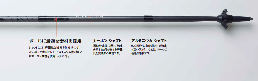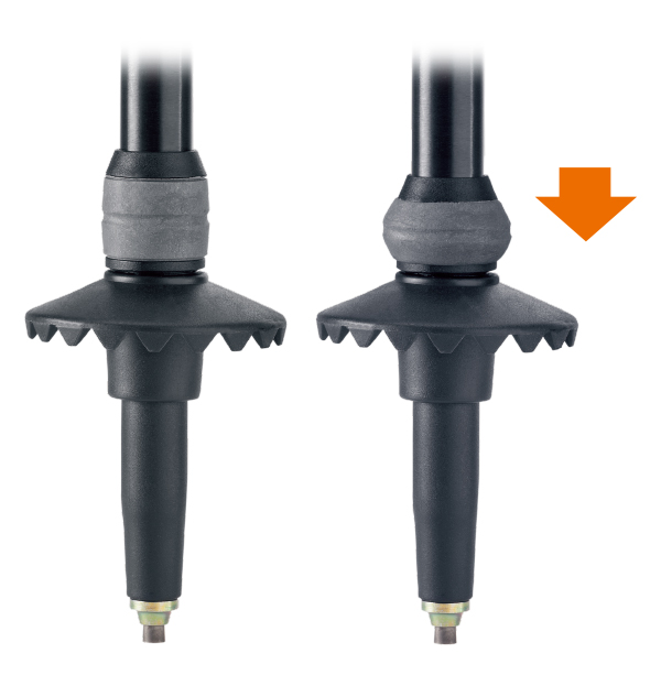 ポールを突いた時の衝撃を軽減するシステムです。下段シャフトに配置することで、手首から遠く、地面から近い位置で衝撃を受け止め、最大時の衝撃を約40%軽減し、関節、筋肉、靭帯への影響を緩和します。従来のアンチショックシステムのバネのような沈み込み感がない、自然な使用感も特長です。