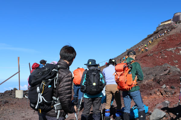 富士山に水道や水場はありません。山小屋の売店で購入することはできますが、あらかじめ500ml×2~3本程度の水は用意。高山病予防に、こまめな水分補給を心掛けましょう。