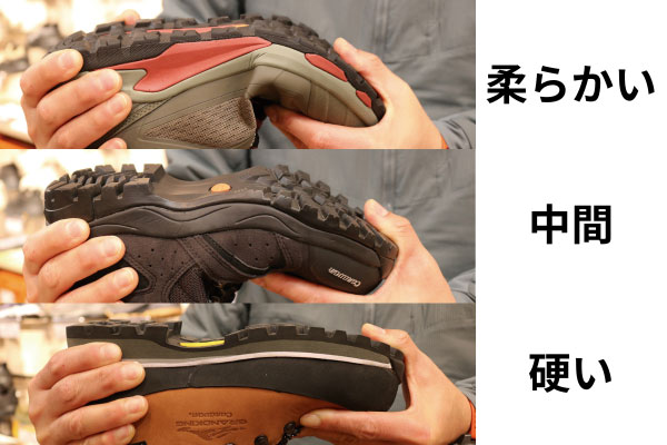 足にぐっと力を入れるとソールが曲がる程度の硬さのものが良いでしょう。