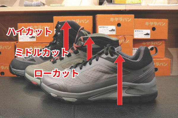 登山靴の履き口は必ずしもミドルカットである必要はありませんが、捻挫のリスクを考えて足首をしっかりホールドしてくれて、整備されていない道も歩きやすいミドルカット以上の靴を選びましょう。